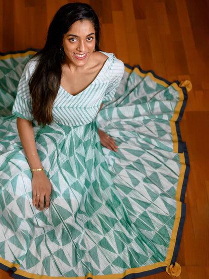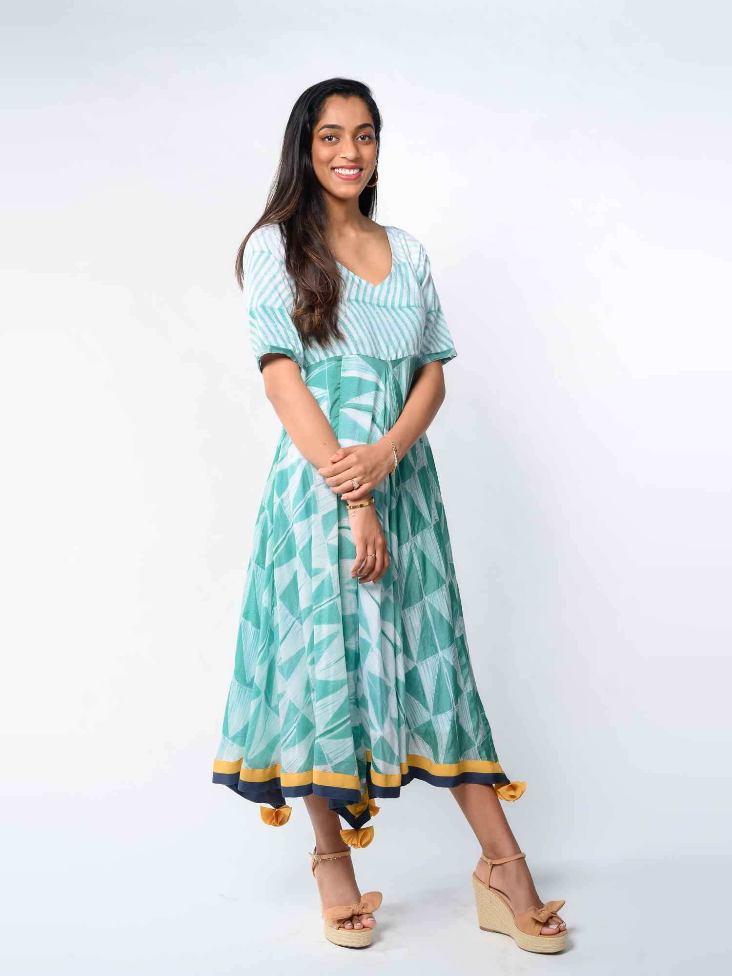 Intricate shibori Empire line asymmetric dress with flowy silhouette & short elbow sleeves. Contrast border and facing at the bottom hem. Dress is made in premium quality vegan silk with fine cotton lining inside. The soft and supple fabric gives the dress a very watery flow and drape.